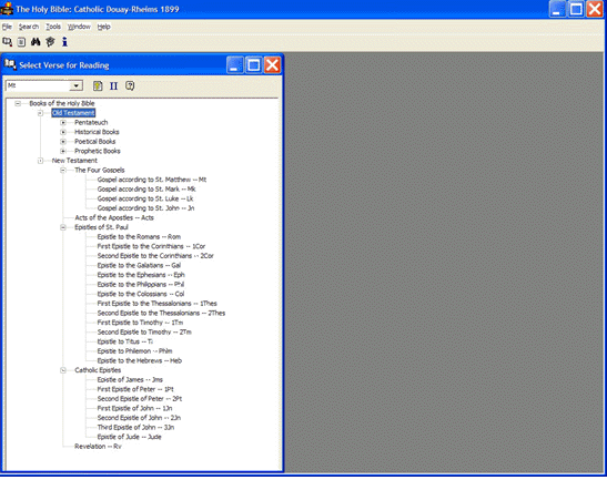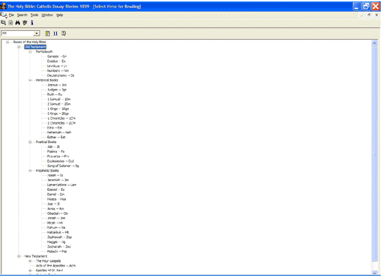 ===== Product Information ===== help file format=== Product: Bible Millennium Edition 2000. (The Catholic Douay-Rheims 1899) Electronic Bible for Windows 95/Me/98/2000/XP ; Version: is 2000.7 Version Date: 26-Sept-2000 Product Type is: Basic Distribution Policy (GPL): FREEWARE, copyrighted but freely distributable & useable product. Processor Family: Intel 80x86 (minimum 80486) Minimum Operating System: Windows 95, or 3.1... Programmer; Dr. Maged Nabih Kamel Boulos (source Zeitun Online) - is no longer availible from Zeitun because they are protestantism against the true church possibly. This is English Version on the left icon, Spanish Bible Version on the right icon.HTML format is tcc digital taken from a differ edu source online. Was scanned in by college students, then proofread and appended with preludes from the TAN Books Publishers Copy by tcc lay people. (XP installations), do not erase your dll files upon install. When the program prompts you if you want to keep the newer xp files, do so by using the YES button. Program asks you several times if you want to keep the newer xp dll files, over the older not installed files for its very install. This Say YES to always, keeping your orignal files, over and over again upon install as many times as it asks you. Or your other softwares that you have may not work anymore. Once you have it downloaded into your computer, then look in the place you have specified of for it to go, and left click upon the setup icon. Program will then install itself. Help File format Program easy to use, uses self explained icons. OR< download VULGATE 4.2 DR software Clementine project, Is execelent search source tool of the entire Holy Scriptures with several early versions of the east text... Including Greek. Comes with auto translate. Whitaker ScreenShots; Help file format. Other HTML file format is not shown.